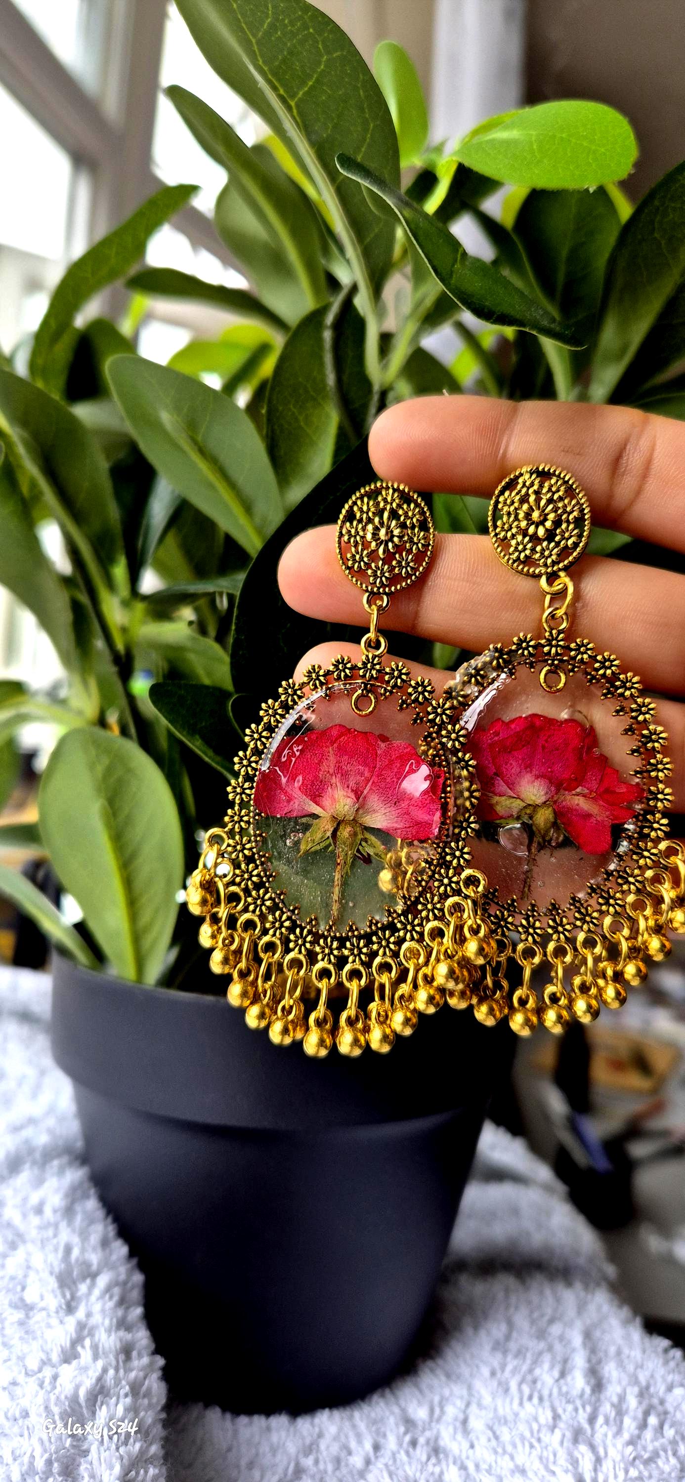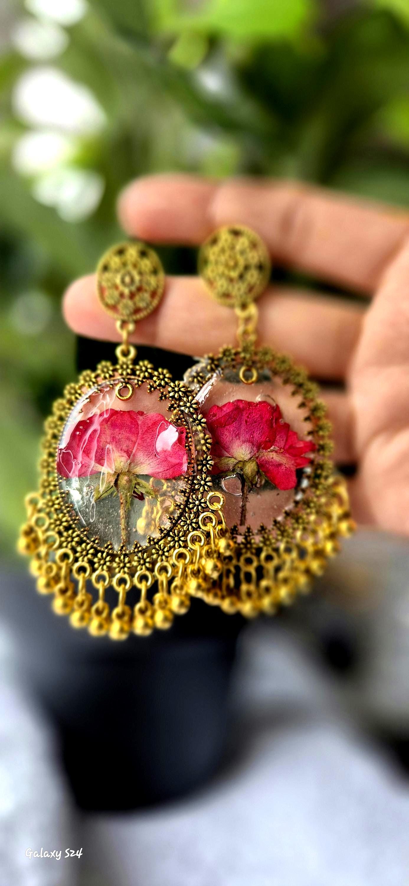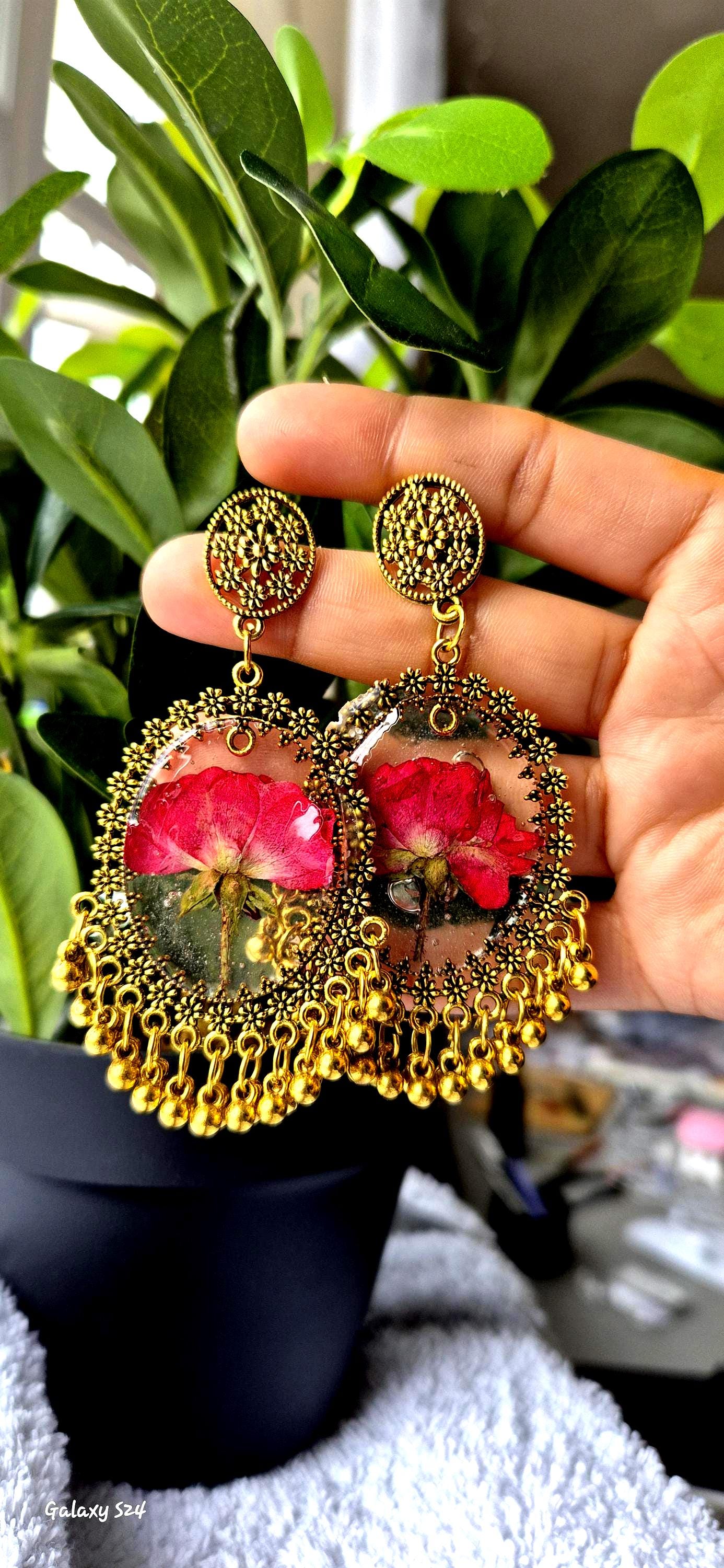 "Beautiful, lightweight resin earrings adorned with real pressed flowers, capturing the natural beauty of nature" Make a bold yet elegant statement with these handcrafted resin earrings featuring genuine dried rose petals. Each earring beautifully encases a full red flower in crystal-clear resin, framed by an ornate antique gold setting with intricate floral motifs. The border is embellished with detailed metalwork and finished with golden drop, style dangles that shimmer with every movement. The round stud top features matching floral detailing, tying the whole piece together with a vintage, royal aesthetic. These earrings are lightweight despite their grand design, making them perfect for festive events, weddings, or simply when you want your jewellery to do the talking.