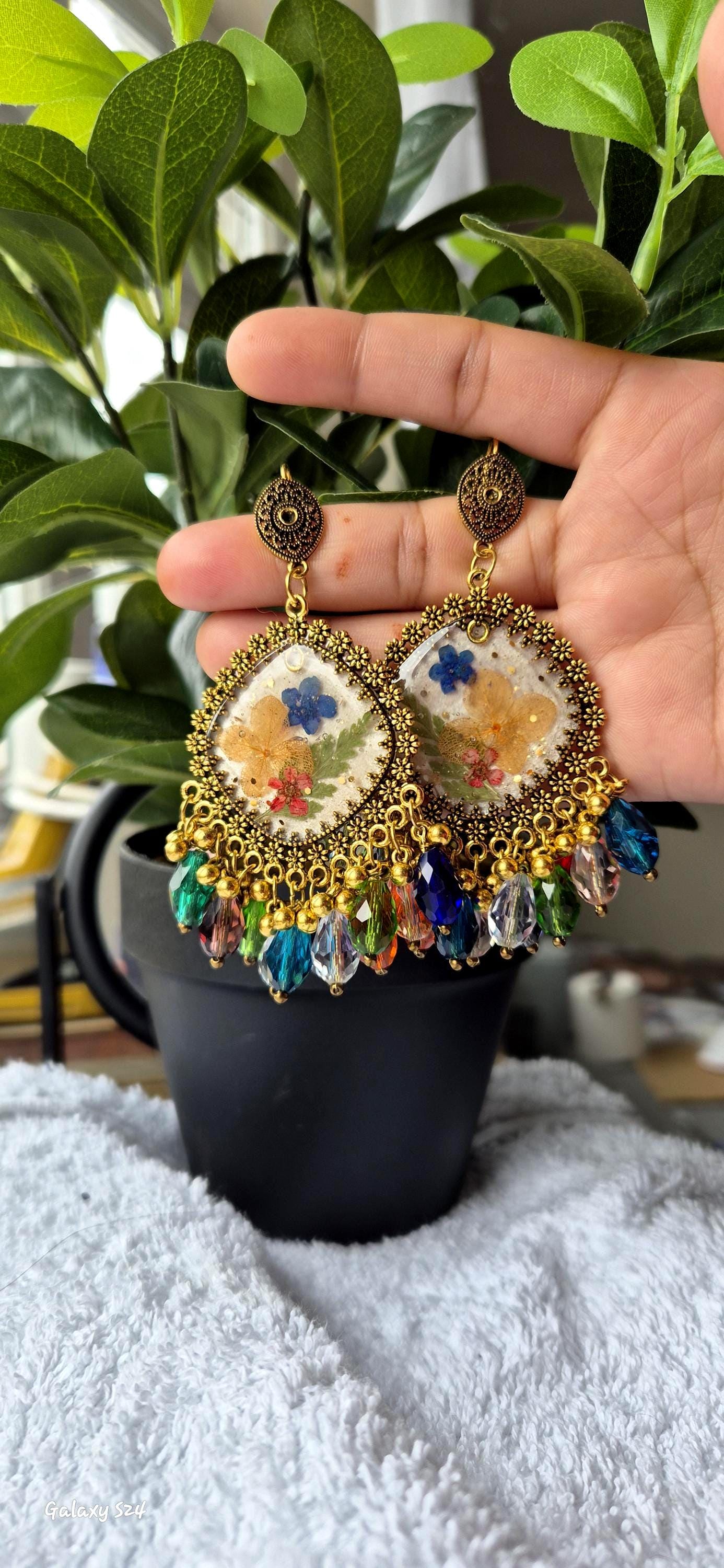 Details: Handmade with real dried flowers in resin Vintage gold-tone floral border Teardrop crystal beads in vibrant colours Lightweight yet eye-catching