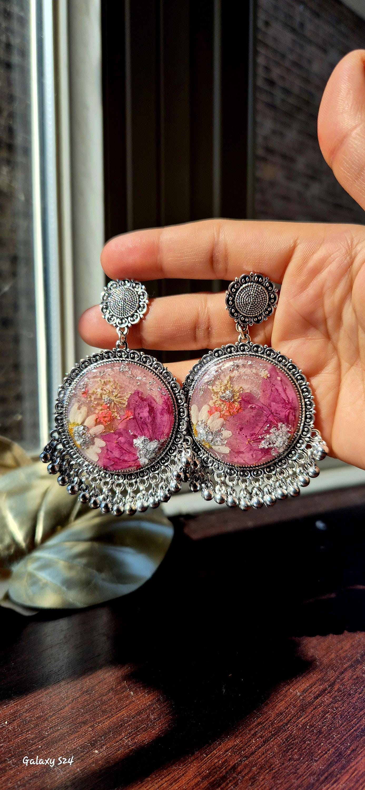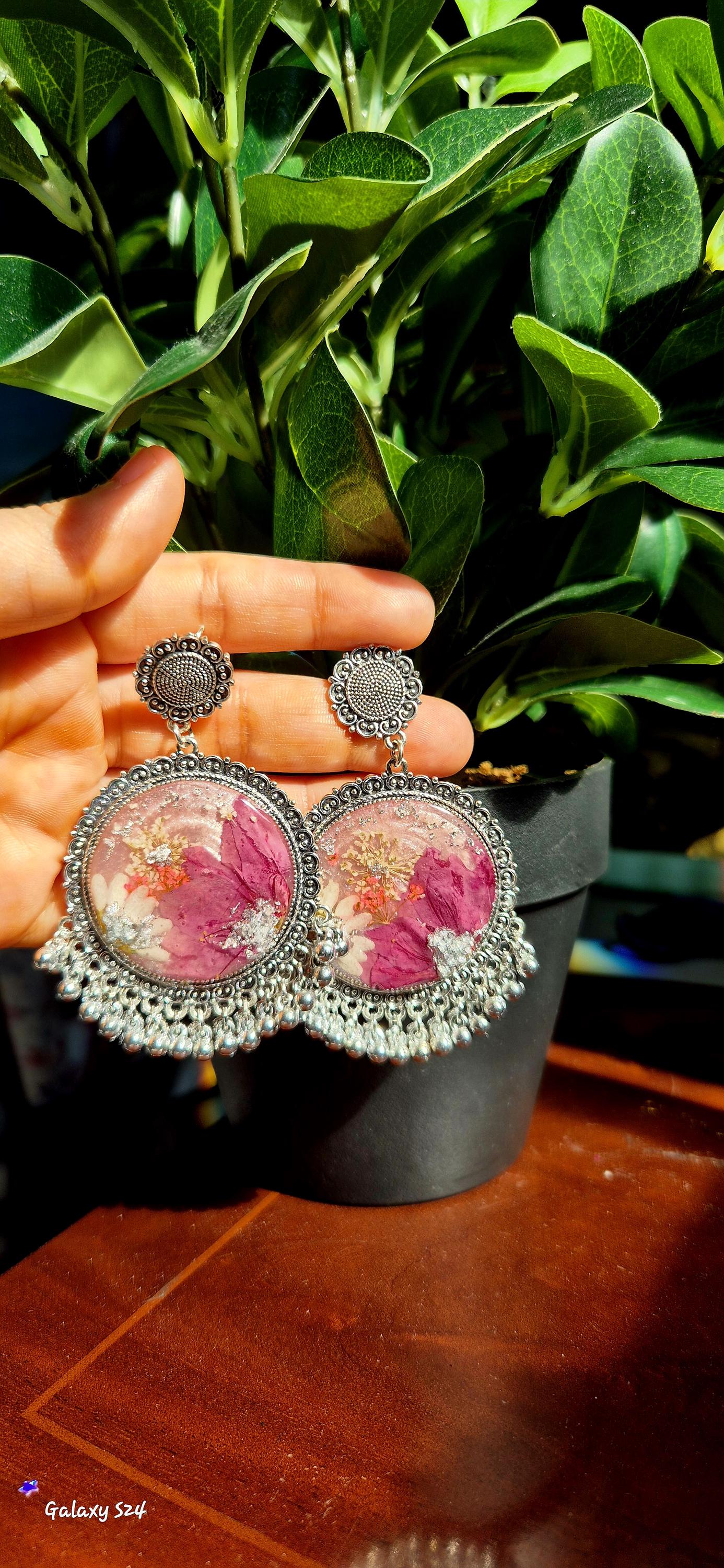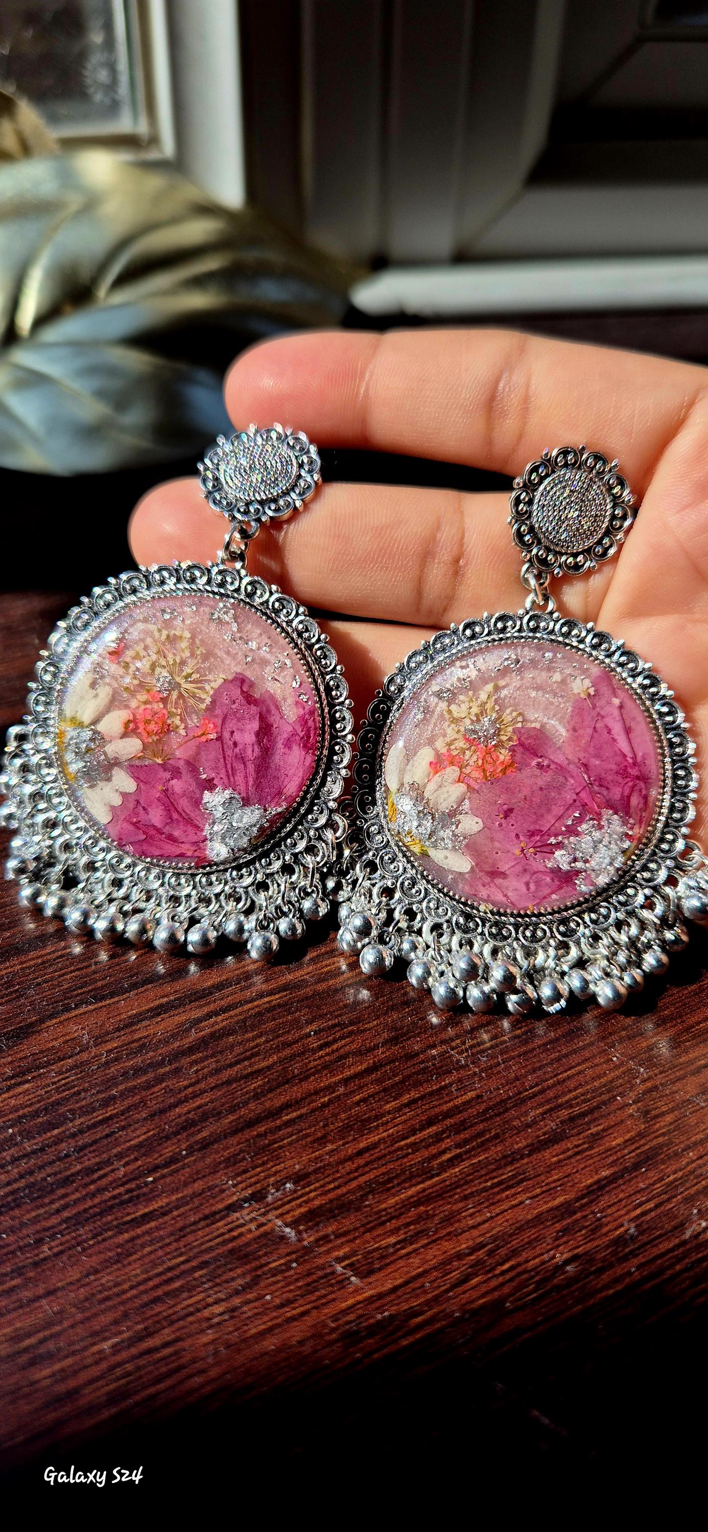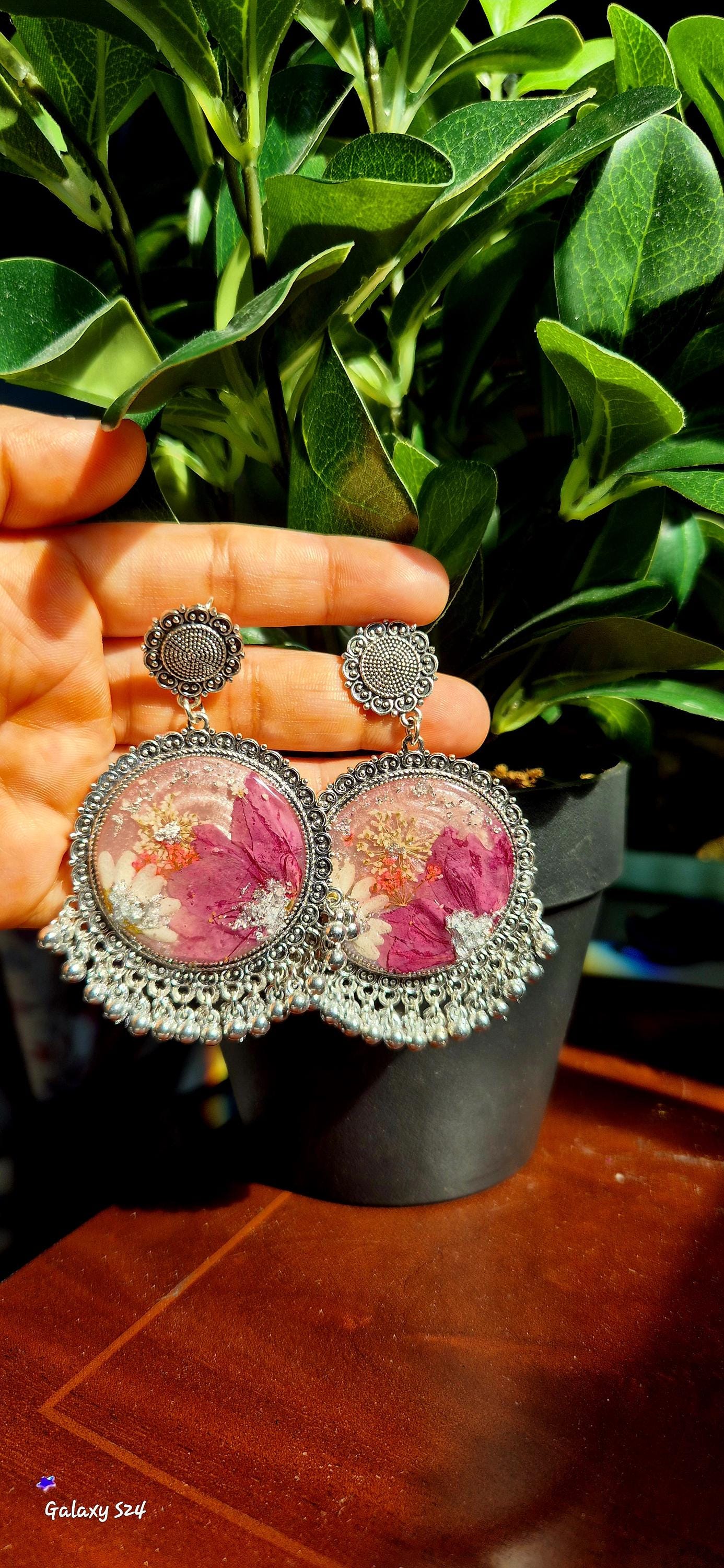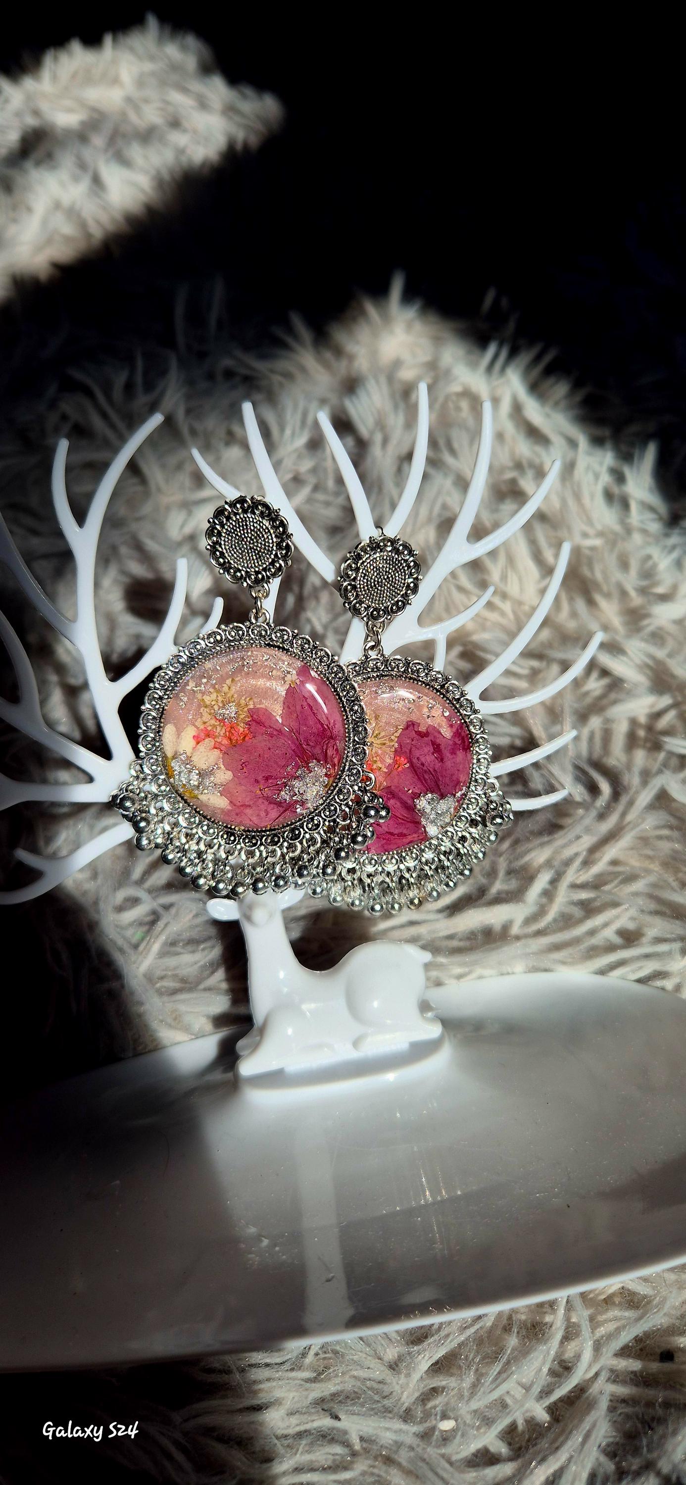 Handmade Soft Pink Base Resin Earrings These earrings feature a soft pink base resin with a floral design. Each piece is crafted with attention to detail, ensuring a unique touch. The floral motif adds a delicate charm to your look. Perfect for those who appreciate handmade accessories. * The earrings come with an ornate silver frame, enhancing their aesthetic appeal. * This combination of soft pink resin and silver frame creates a harmonious balance. * Ideal for adding a subtle yet stylish element to any outfit. The earrings showcase a floral design, bringing a natural vibe to your ensemble. Their handmade nature ensures each pair is distinct. Enjoy the beauty of nature in every wear.