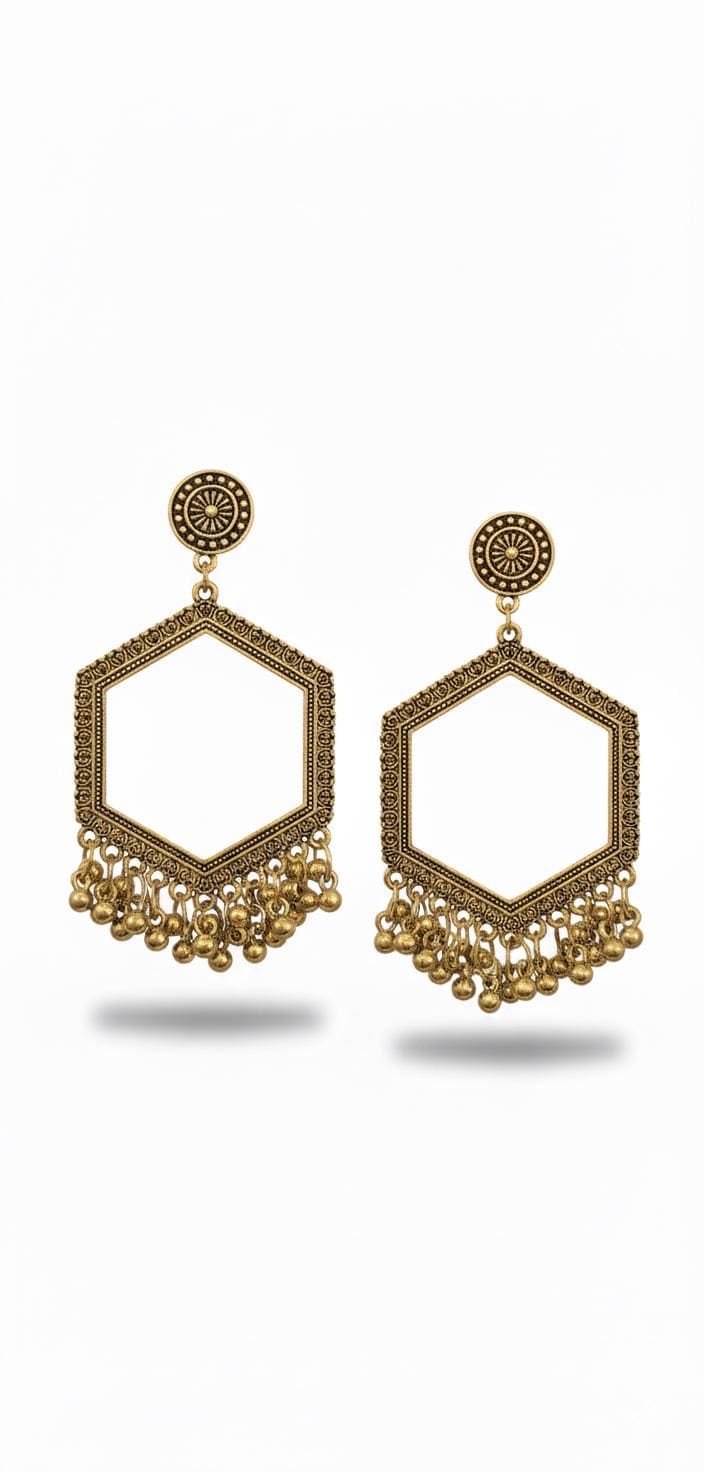 Jhumka Base Earrings: These earrings feature a jhumka base design, perfect for a traditional look. Golden Colour: The earrings are crafted in a golden hue, adding a touch of elegance to any outfit. Ornate Design: With intricate detailing, these earrings offer a sophisticated appearance. Jhumka Base Earrings in Golden Colour with Hanging Details. These earrings are designed with a jhumka base, offering a classic and timeless appeal. The golden colour enhances their ornate design, making them suitable for various occasions. The hanging details add a unique flair, ensuring these earrings stand out. Perfect for those who appreciate detailed craftsmanship in their accessories.