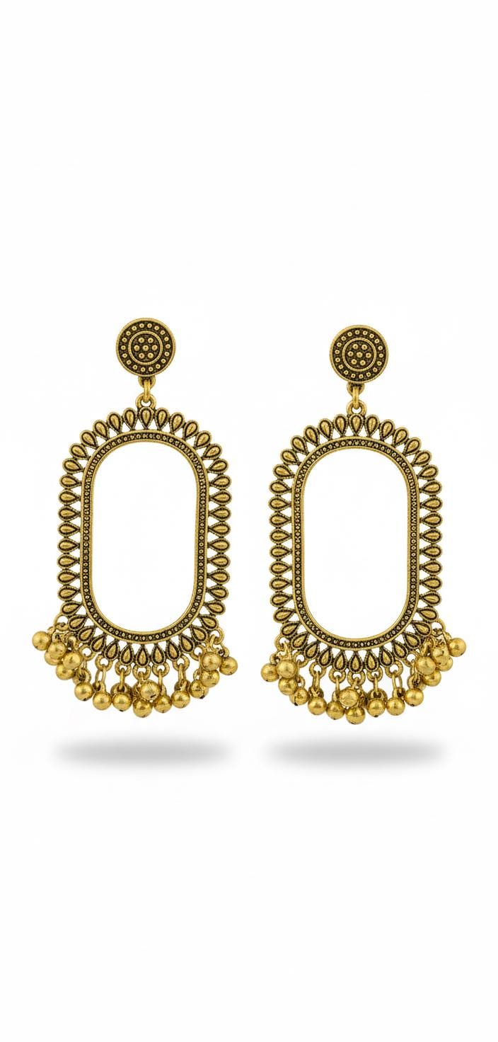 Jhumka Base Earrings: These earrings feature a jhumka base design, perfect for a traditional look. Golden Colour: The earrings are crafted in a golden hue, adding a touch of elegance to any outfit. Ornate Design: With intricate detailing, these earrings offer a sophisticated appearance. Jhumka Base Earrings in Golden Colour with Hanging Details. These earrings are designed with a jhumka base, offering a classic and timeless appeal. The golden colour enhances their ornate design, making them suitable for various occasions. The hanging details add a unique flair, ensuring these earrings stand out. Perfect for those who appreciate detailed craftsmanship in their accessories.