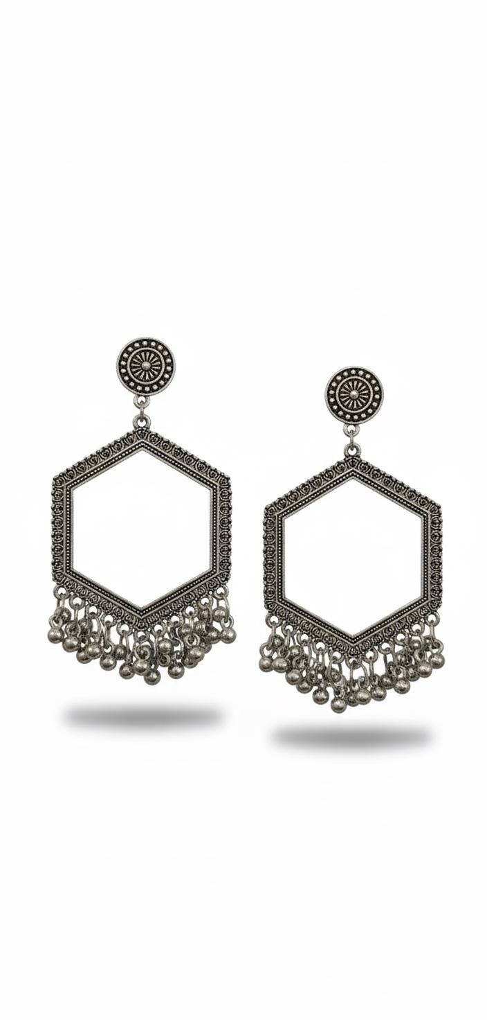 Make a bold statement with these stunning oxidized silver earrings. Featuring a distinctive tribal or ethnic aesthetic, these earrings are a perfect blend of traditional craftsmanship and modern design. Design: The main body is a large, open hexagon shape, framed with intricate filigree and beaded detailing, giving them an antique, vintage feel. Embellishment: The bottom is adorned with numerous tiny ghungroo bells (dangling metal beads), which create a soft, gentle jingle with movement. Closure: They feature a traditional stud post with a decorative circular top. Material: High-quality metal with an oxidized finish for a dark, rustic, and authentic silver look.