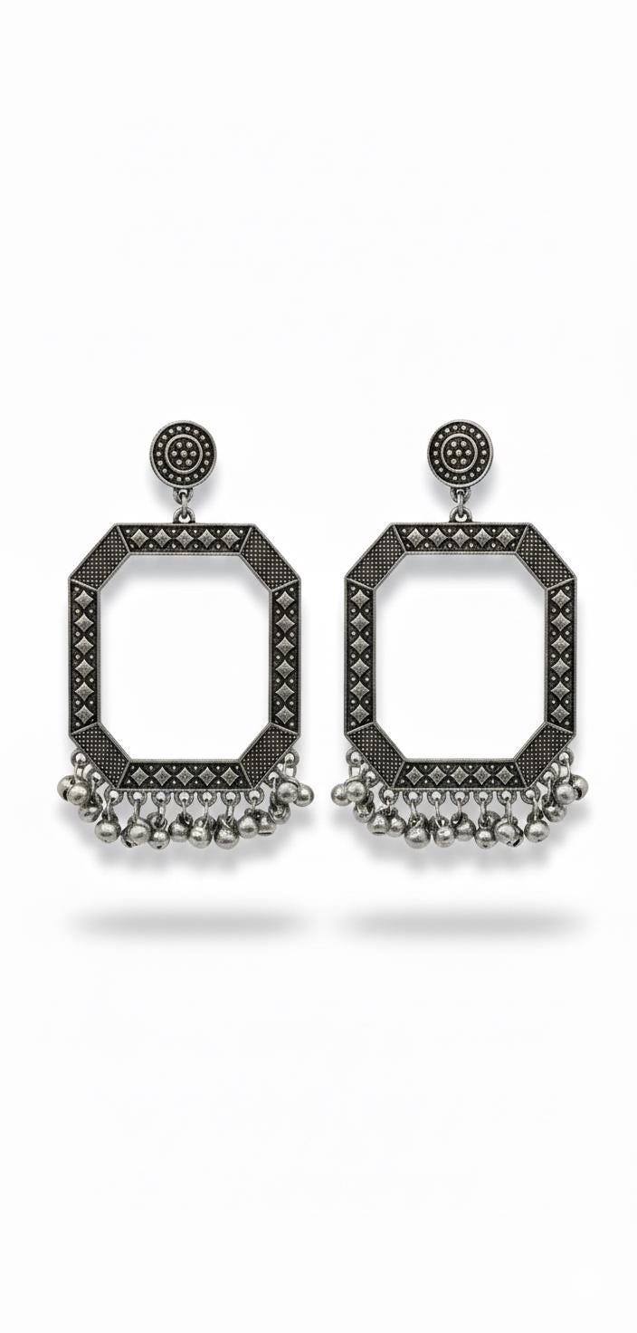 Make a bold statement with these stunning oxidized silver hexagon drop earrings. Featuring a distinctive tribal or ethnic aesthetic, these earrings are a perfect blend of traditional craftsmanship and modern design. Design: The main body is a large, open hexagon shape, framed with intricate filigree and beaded detailing, giving them an antique, vintage feel. Embellishment: The bottom is adorned with numerous tiny hanging. Closure: They feature a traditional stud post with a decorative circular top. Material: High-quality metal with an oxidized finish for a dark, rustic, and authentic silver look.